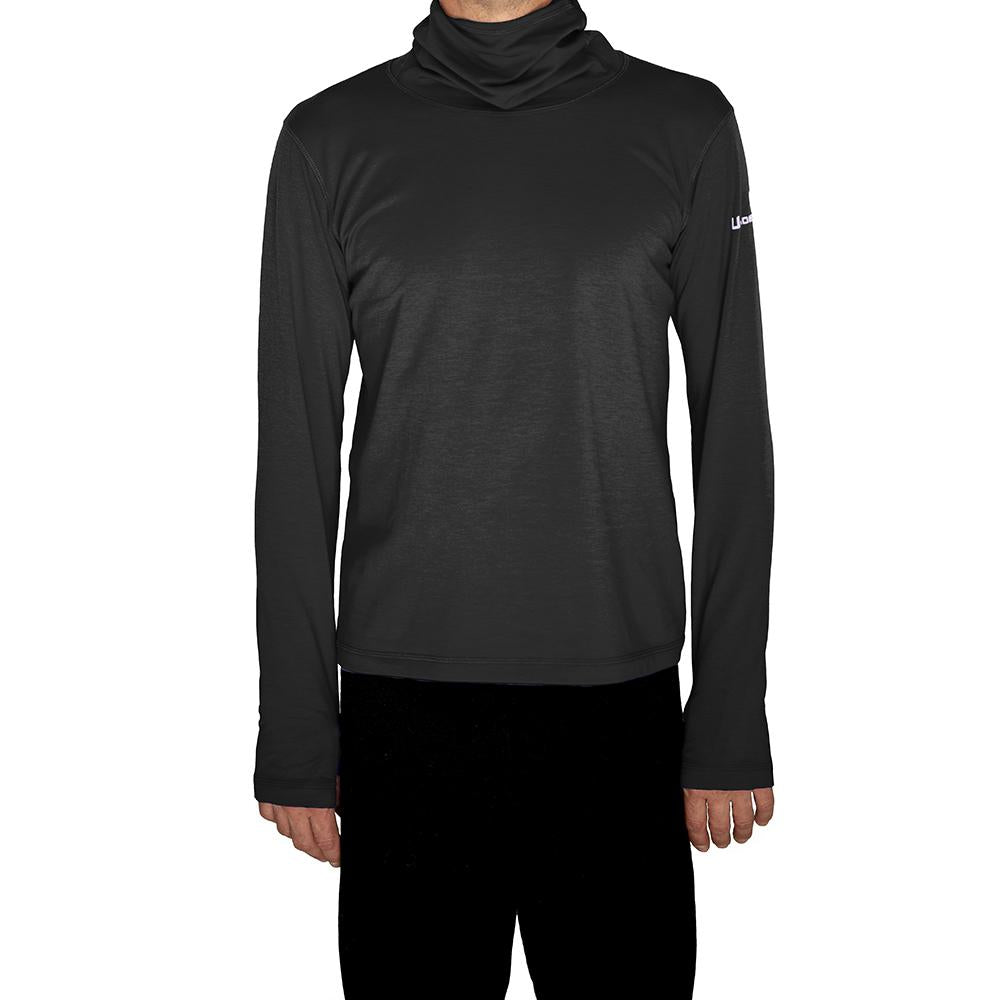 Our newest shirt, the Pinnacle Plus is an ideal layer for outdoor activities in colder weather. Built-in hood and face covering is optional — can be pulled up or rest easily around the neck. Designed to fit comfortably under a helmet. Perfect for skiing, snowboarding, hiking, dog walking, sports, camping and more. Cozy with just enough stretch, the Pinnacle Plus will keep you warm and comfortable no matter where your day takes you.
